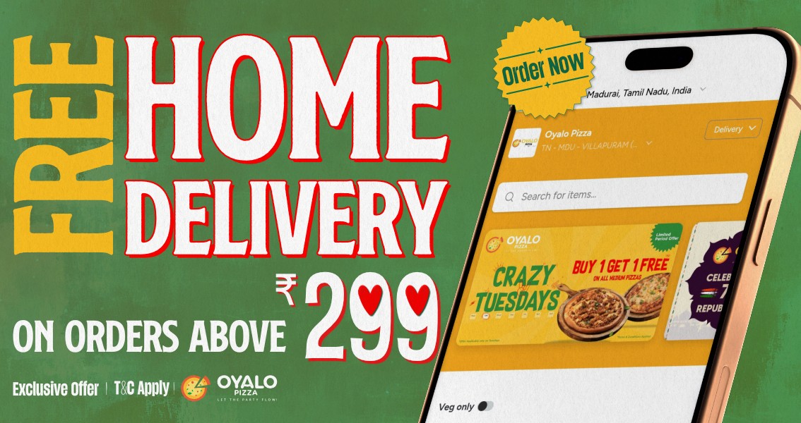 With over 40 stores across Tamil Nadu, in cities like Coimbatore, Kumbakonam, and Mayiladuthurai, Oyalo is proud to serve flavorful pizzas to local communities. Our signature stores provide a welcoming space, perfect for quick bites or leisurely meals with family and friends.